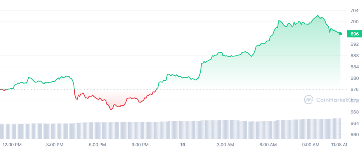 Le cours MKR est en hausse de 2,92 % sur la journée, grâce à une envolée progressive sur les dernières 24 heures. Cependant, sur les dernières heures, le jeton a perdu de sa superbe et s’échange actuellement à 696 $.