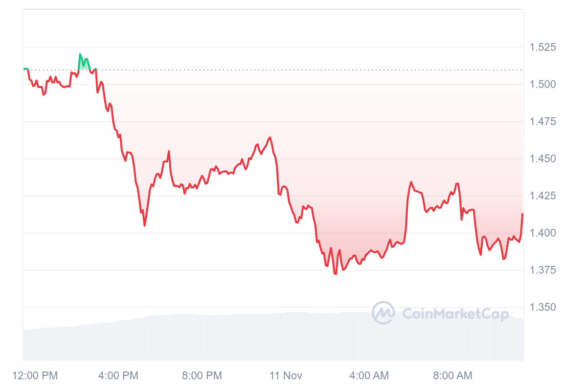 Pire encore, la cryptomonnaie de Mantra retrace aujourd’hui en accusant des pertes à hauteur de 6,56 %. Le cours du jeton reste toutefois élevé avec un prix d’échange de 1,41 $.