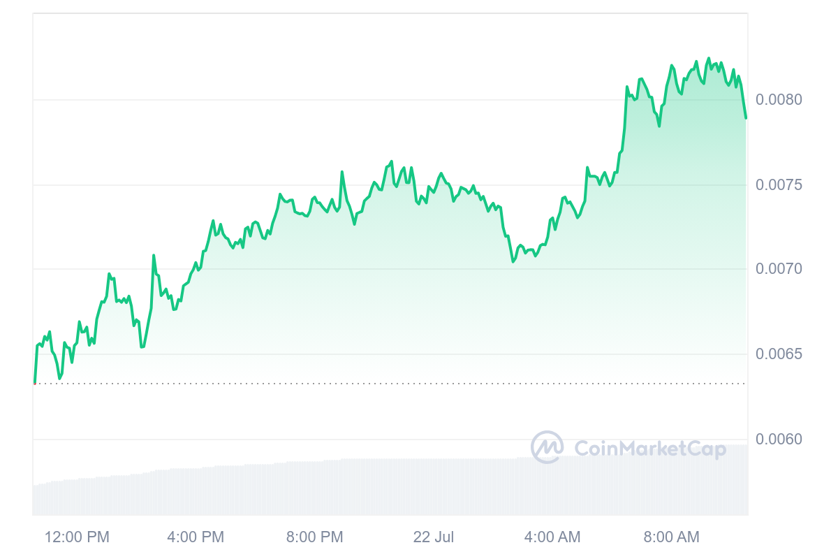 Sur les dernières 24 heure, le MEW a jeté en pâture les autres meme coins pour venir s’installer seul en tête de ce top & flop crypto. L’ascension est ainsi rapide et remarquable, avec une hausse de 25 % qui propulse le prix du jeton à 0,00788 $.
