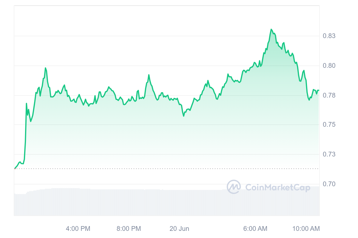Sur les dernières 24 heures, c’est moins la folie du côté du cours du JUP mais tout de même, c’est 9,37 % en plus pour un jeton qui se revalorise à 0,78 $.