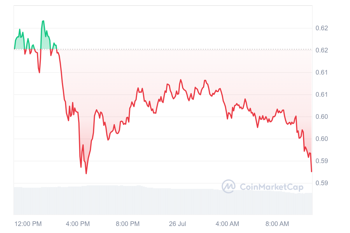 Au contraire, ce dernier est le leader du mouvement baisser, avec une perte de vitesse de 4,36 %. A cause de ces déboires, le jeton de Ripple perd les 60 centimes et vient se situer à un prix de 0,587 $.