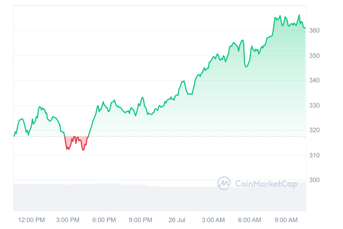 Sur les dernières 24 heures, le TAO a bien profité du retour de la hausse, en signant la meilleure performance du jour. Désormais, le jeton est valorisé à 360 $ après cette très belle hausse de 13,49 %.