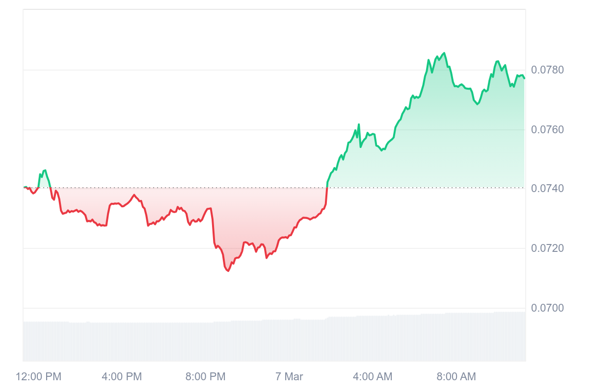 On est loin des magnifiques journées mais tout de même, le XDC est dans le vert et arrive à gagner 5 %. En conséquence, le jeton arrive à remonter à 0,078 $.