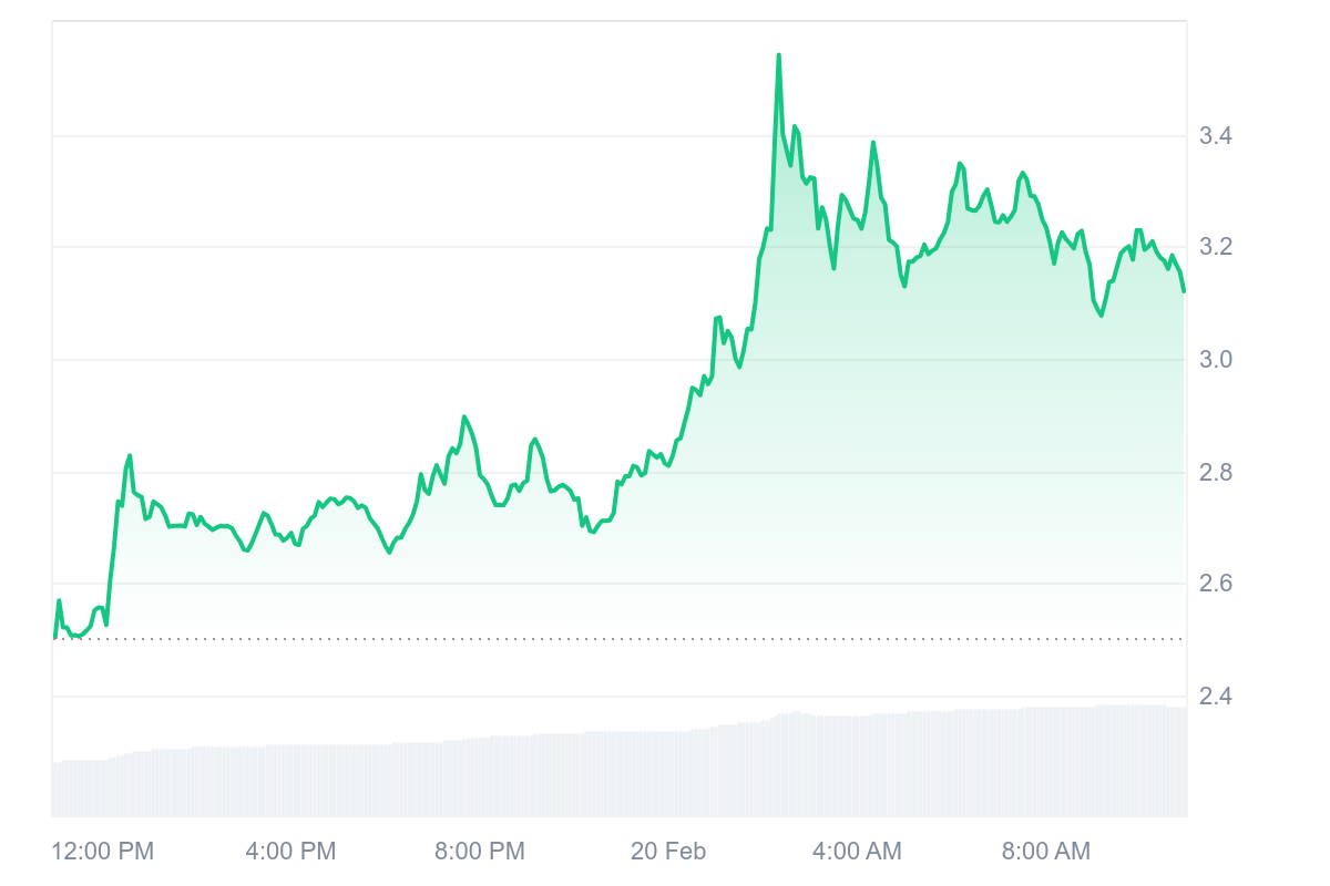 Le jeton a même signé un ATH record pendant la nuit avec un bond dépassant les 3,50 $. Au moment de rédaction, la hausse est toujours bonne à prendre avec un gain de 24,96 $ qui laisse le cours IP au-dessus des 3,12 $.