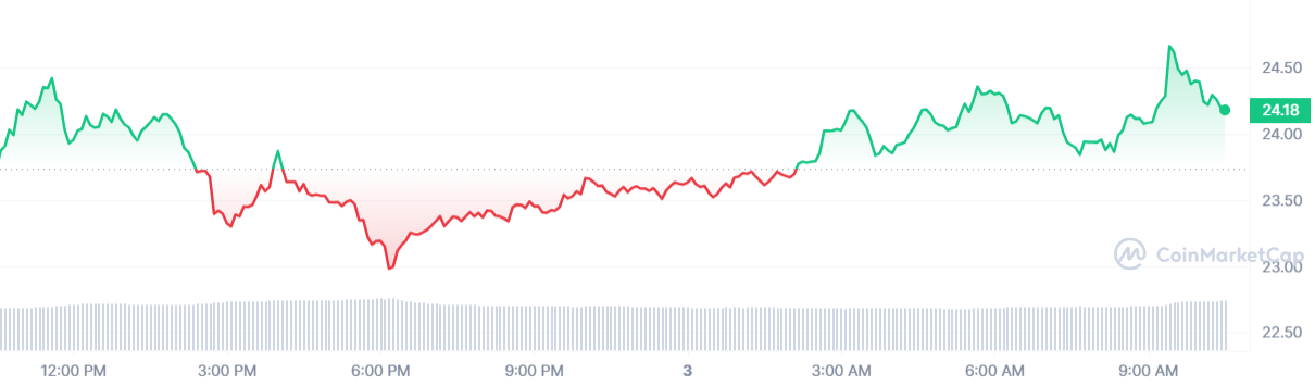 Sur les dernières 24 heures, le cours SOL s’est bien maintenu, ce qui laisse la porte ouverte au jeton pour aller voir plus haut. Avec une hausse de 1,59 %, le jeton vaut maintenant 24,18 $.