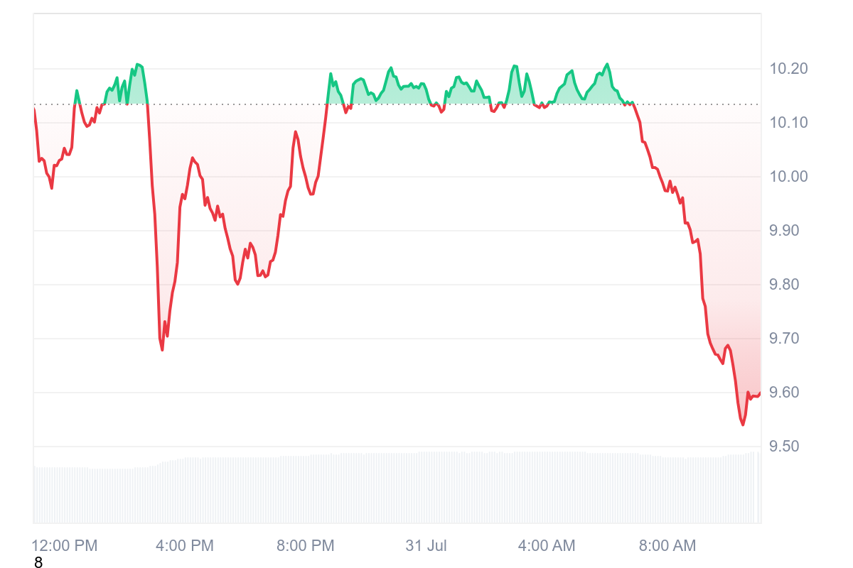 En raison d’une chute journalière de 4,39 %, le jeton d’Uniswap se négocie à la baisse, aux alentours des 9,60 $.