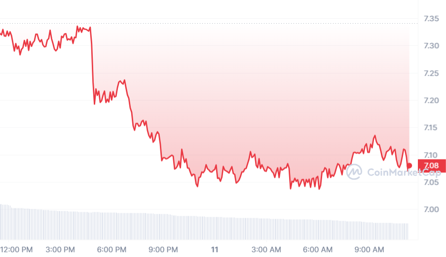 Sur la journée, APTOS perd donc 3,35 %. Le prix de l’actif retombe légèrement par la même occasion. Il s’échange désormais à 7,08 $.