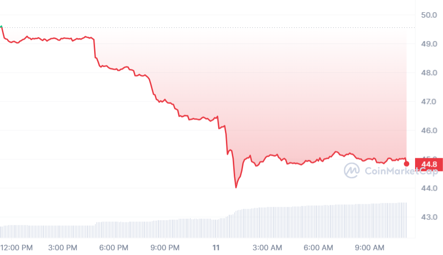 Le cours GMX est donc encore en baisse ce vendredi. Après une baisse qui flirte avec les 10 %, le prix du jeton chute jusqu’à 44,80 $.