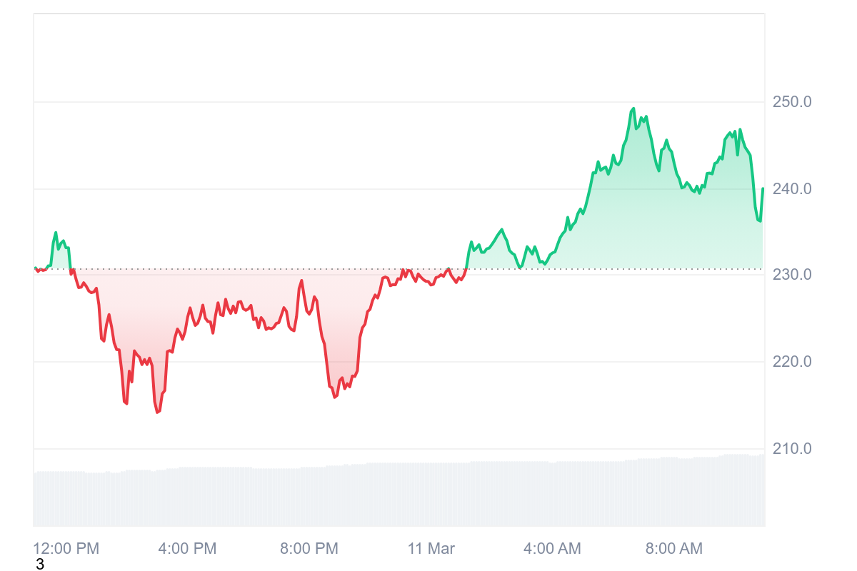 Le cours du TAO a changé de combinaison en milieu de journée et c’est tant mieux ! La pièce de Bittensor a gagné 4,02 % sur la journée et son prix s’élève à 239,90 $.
