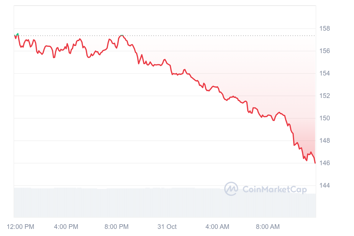 Le jeton AAVE a progressivement reculé avec une baisse de prix de plusieurs dollars. Au moment de rédaction, le jeton s’échange à 145,98 $ après une chute de 7,21 %.