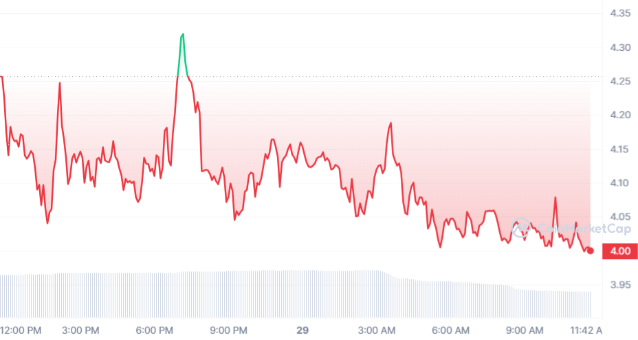 SponsoredAu moment de rédaction, il est à la limite des 4 $, ce, à cause d’une baisse de 6,19 %. Par la même occasion, il signe la pire performance du top 100 crypto.