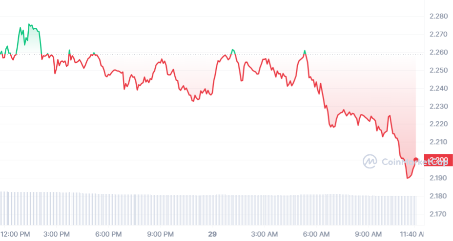 Le cours du CAKE est désormais en baisse de “seulement” 2,49 % sur les dernières 24 heures. Le jeton est toutefois retombé par rapport à ses sommets du mois et s’échange pour un prix unitaire de 2,20 $.