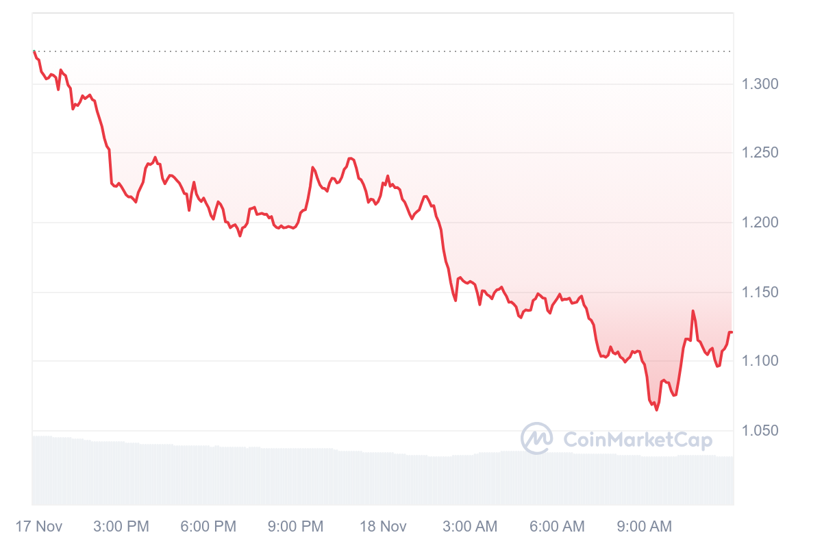 SponsoredMalheureusement, le rouge fait son retour sur le cours de certaines cryptomonnaies et notamment du GOAT, qui accuse des pertes à hauteur de 15,52 %. Dorénavant, l’actif s’échange à 1,11 $.