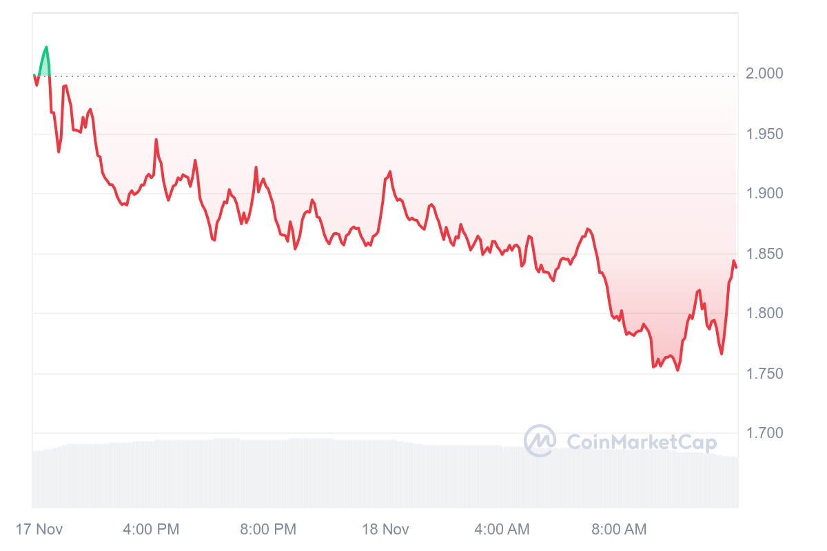 Le graphique est clair : la journée a été délicate avec une baisse de régime constante. POPCAT a ainsi perdu plus de 10,78 % et s’échange dorénavant à 1,79 $.