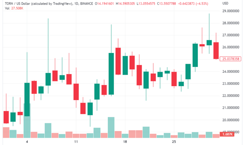 Le cours de la crypto TORN a ouvert le 1er juillet à 20,73 $, a atteint un sommet mensuel de 28,39 $ avant de tester un creux mensuel de 19,56 $ et de clore le mois à 25,09 $. Dans l’ensemble, on a pu observer une croissance de 21 % entre son prix d’ouverture et de clôture du mois de juillet.
