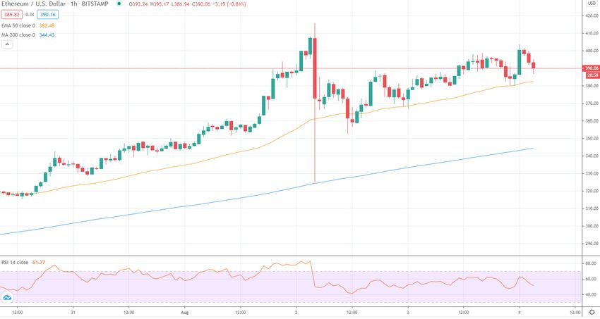 Pour la deuxième fois en 48h environ, l’ETH a atteint le niveau crucial des 400 dollars. La plus récente montée à cette zone a eu lieu il y a quelques heures, lors d’une séance de négociation en Asie, selon Tradingview.com. Le site a également noté une légère redescente, le cours ayant chuté à 390 dollars au moment de la rédaction de cet article.