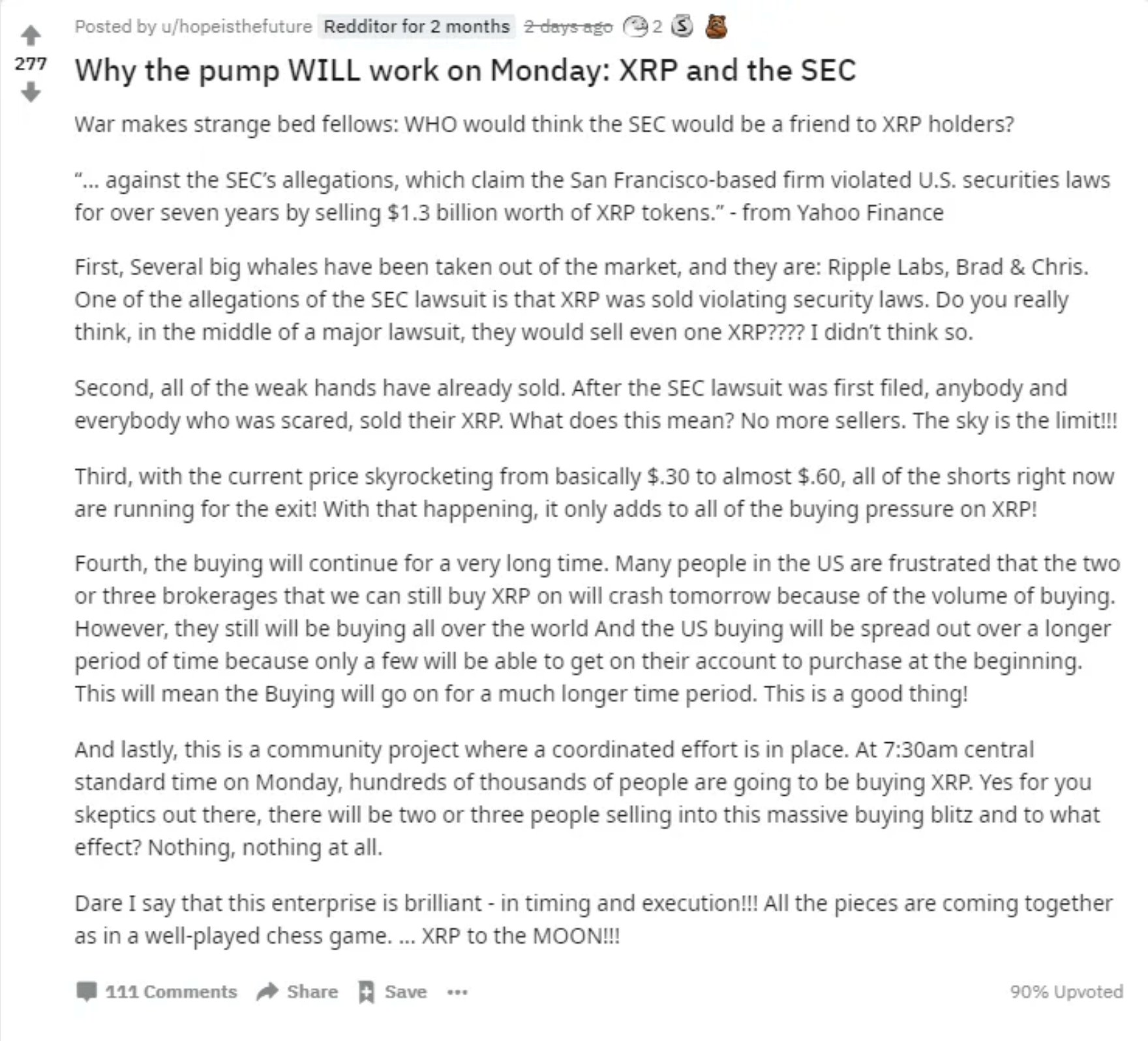 La manipulation de l’actif XRP a été orchestrée et motivée en dehors du forum WallStreetBets. Néanmoins, le sentiment «d’acheter et de conserver» a été repris dans les discussions concernant le XRP, même s’il n’y avait pas de base fondamentale pour la stratégie. Dans un message désormais supprimé sur r / Ripple, un utilisateur a déclaré: “Pourquoi la manipulation du marché fonctionnera dès lundi.”
