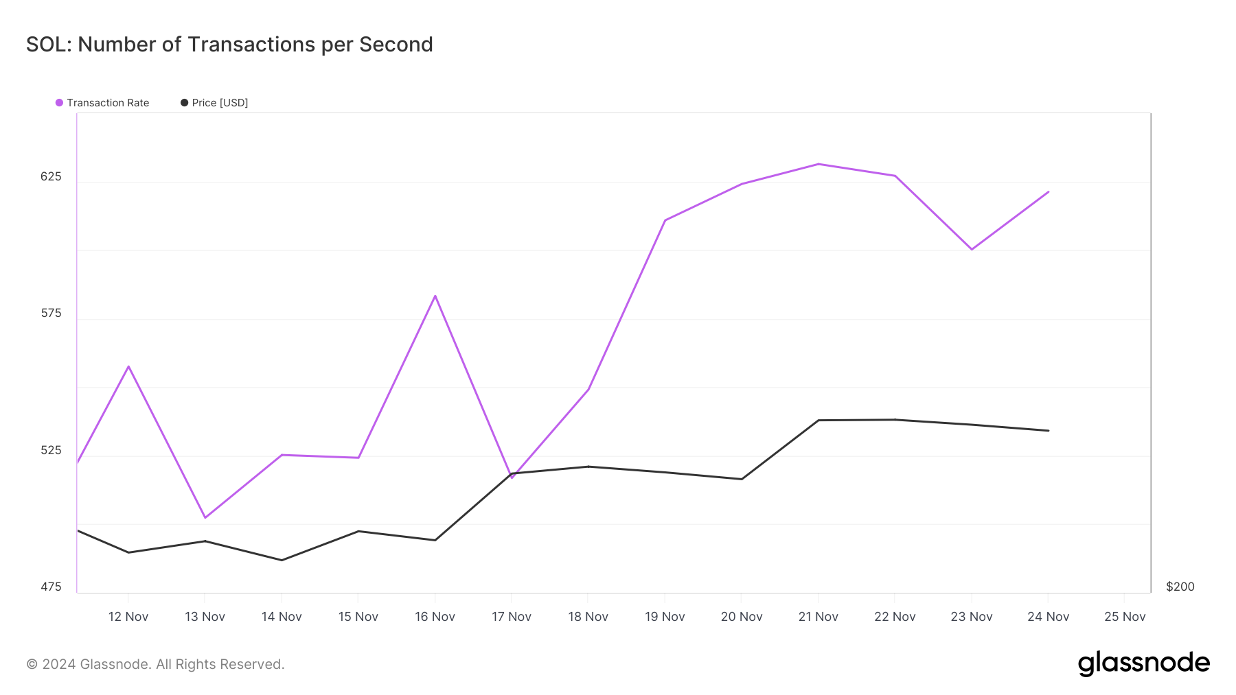Ainsi, un taux de transaction en hausse signale une activité et un engagement accrus des utilisateurs avec la crypto, tandis qu’une baisse indique un intérêt réduit. Selon Glassnode, le taux de transaction de Solana est en hausse. Si cette tendance se maintient, cela pourrait propulser le cours du SOL au-delà de son sommet historique.