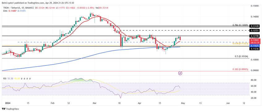 Le cours du Tron a rebondi depuis son creux de 0,109 $, évitant ainsi la formation d’une death cross. Ce phénomène bearish se produit lorsque l’EMA de 200 jours croise l’EMA de 50 jours. Cependant, une soudaine poussée du cours du Tron a entraîné l’aversion de cette death cross.