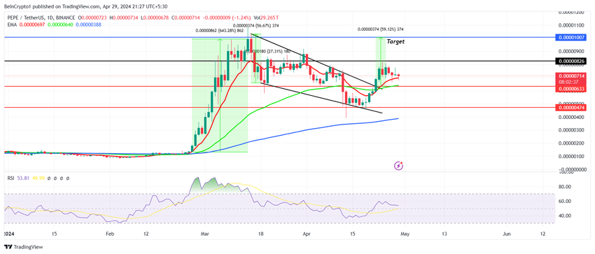 Malgré la concurrence acharnée de dogwifhat (WIF), Pepe (PEPE) a surpris le marché avec son dernier rallye. Au cours des trois derniers mois, le meme coin a connu une croissance de 586 %.