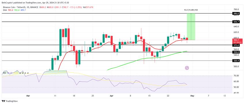 Le prix du BNB est en pleine consolidation depuis plus d’un mois et demi. L’actif a, par le passé, tenté à plusieurs reprises de clôturer au-dessus des 640 $, mais sans succès. En conséquence, l’altcoin est resté bloqué entre les 560 $ et les 620 $.