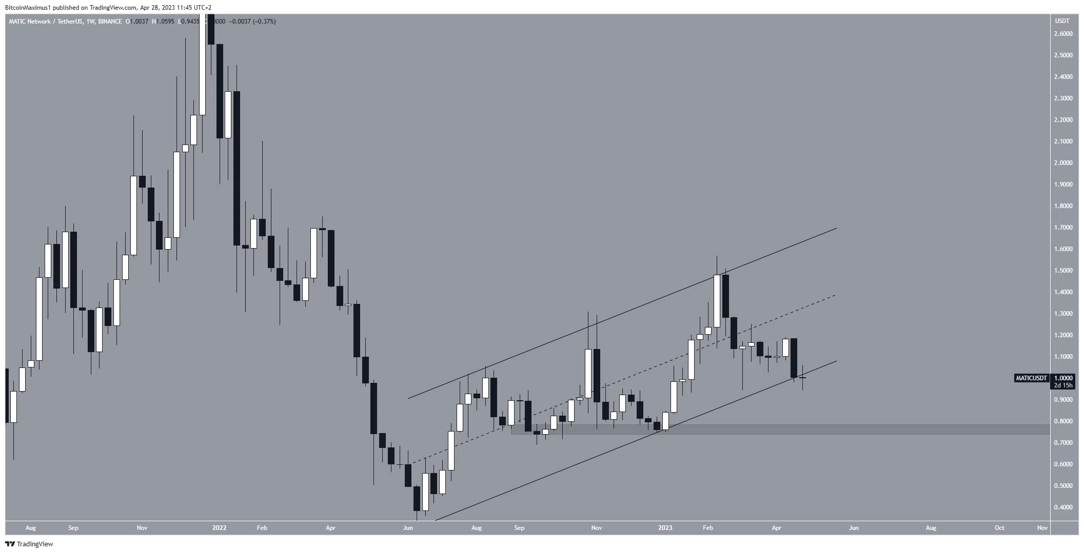En effet, le cours MATIC se négocie légèrement en dessous de la ligne de support d’un canal parallèle ascendant à long terme.