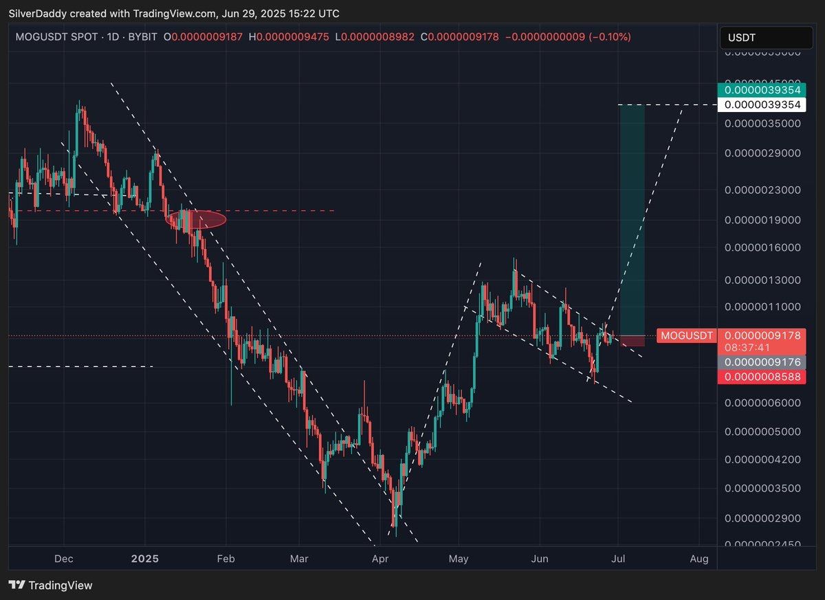 Par rapport aux autres meme coins, MOG affiche une configuration plus avancée dans le cycle : il a validé son retracement et se trouve déjà dans la phase de reprise. Ce timing peut jouer à son avantage en juillet, surtout dans un marché où peu d’actifs affichent des patterns aussi nets. Si les volumes suivent, MOG pourrait être l’un des premiers à exploser en cas de regain d’intérêt sur ce segment.