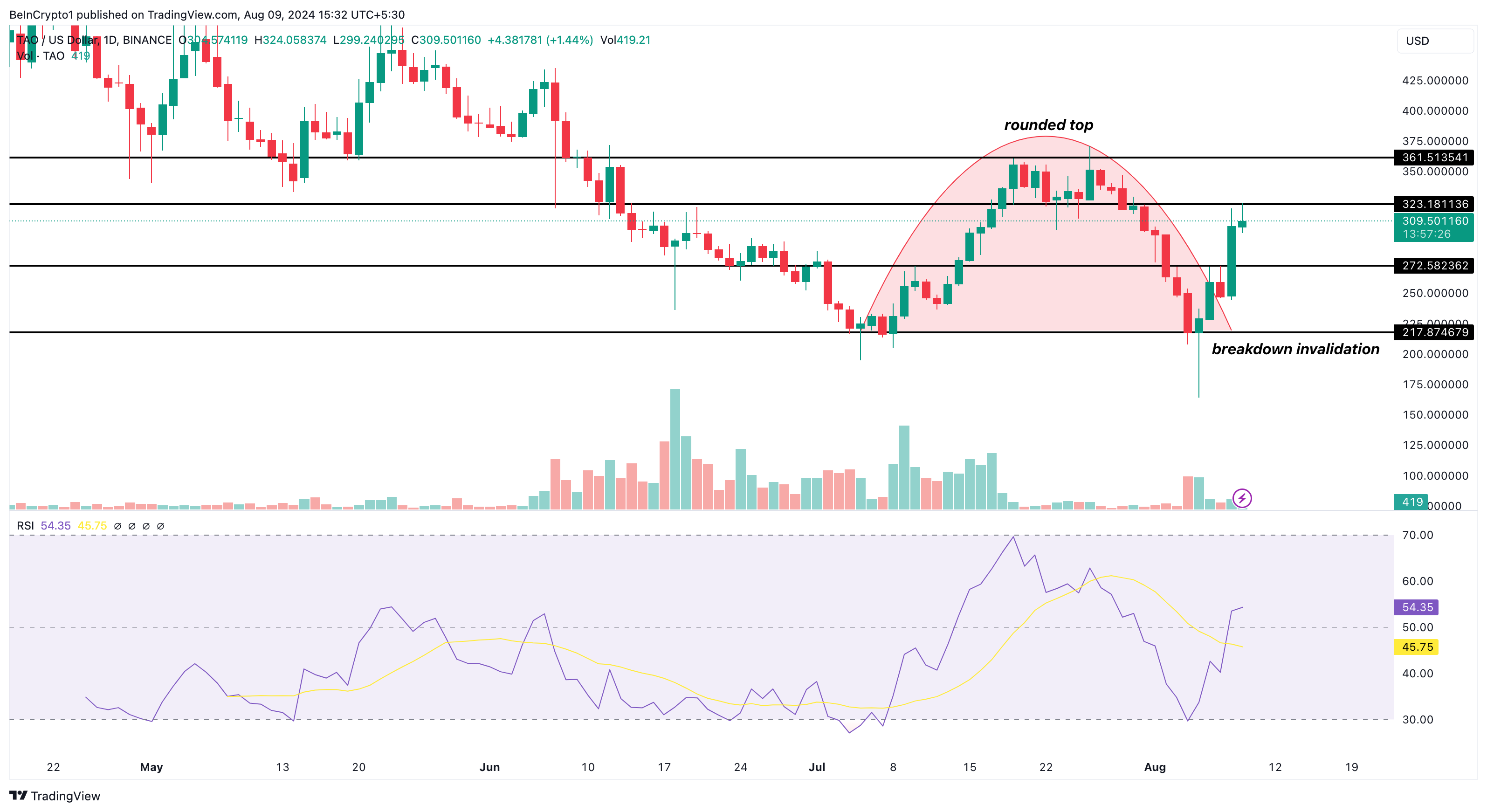 Avant l’ascension récente de TAO, son graphique journalier révélait un sommet arrondi. Souvent perçu comme un indicateur baissier, ce motif en forme de dôme suggère une pression vendeuse accrue. Toutefois, le seuil de soutien à 217,87 $ a contrecarré toute dégringolade.