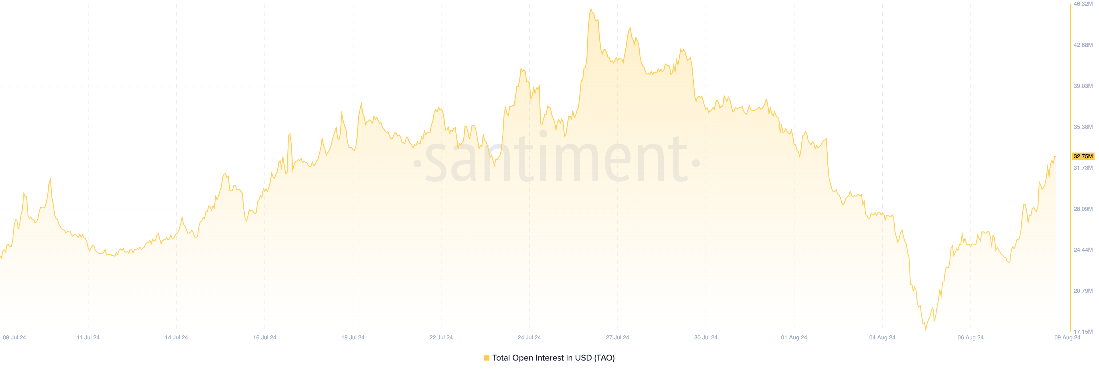 À la suite de cette annonce, les opérateurs sur le marché des dérivés ont renforcé leur position sur TAO. D’après Santiment, l’intérêt ouvert associé à TAO s’élevait à environ 17 millions de dollars. Actuellement, ce chiffre a presque doublé.