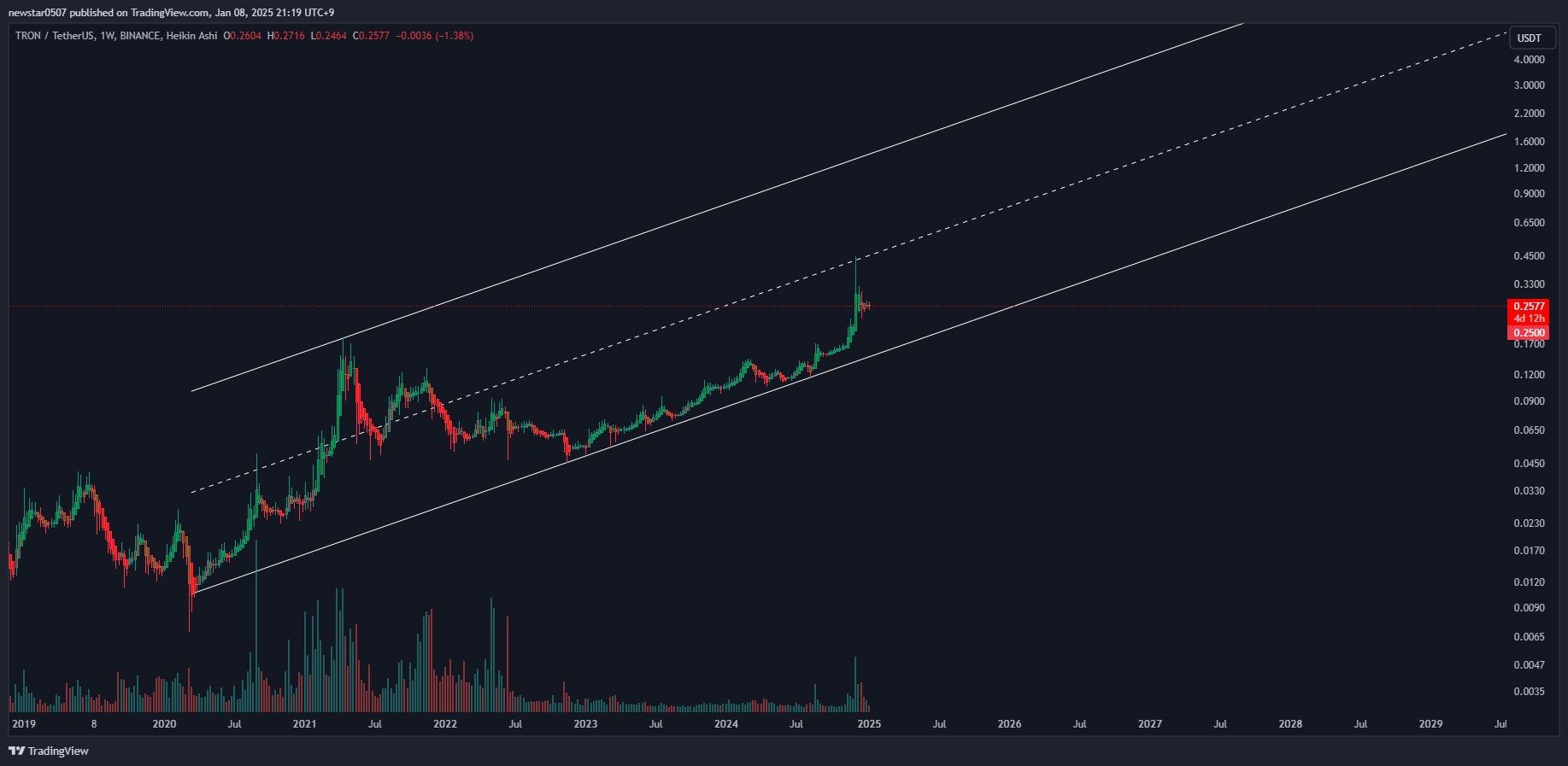 Pour sa part, l’analyste EWT adopte une approche plus globale. Il anticipe une période d’accumulation pour TRON, oscillant entre 0,17 $ et 0,27 $. EWT s’appuie sur une structure graphique en triangle ascendant pour prédire une éventuelle rupture haussière. Son premier objectif pour TRX ? Un retour à 1,3 $.