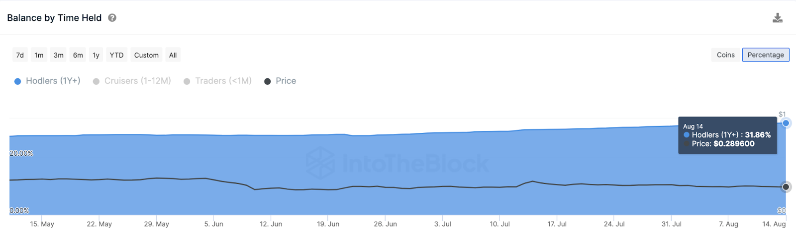 Le 5 juin, soit juste avant le début du procès de la SEC contre Binance et Coinbase, les investisseurs à long terme détenaient 27,71 % de l’offre en circulation d’ADA. Au moment où nous publions ces lignes, ce chiffre s’élève à 31,86 %.