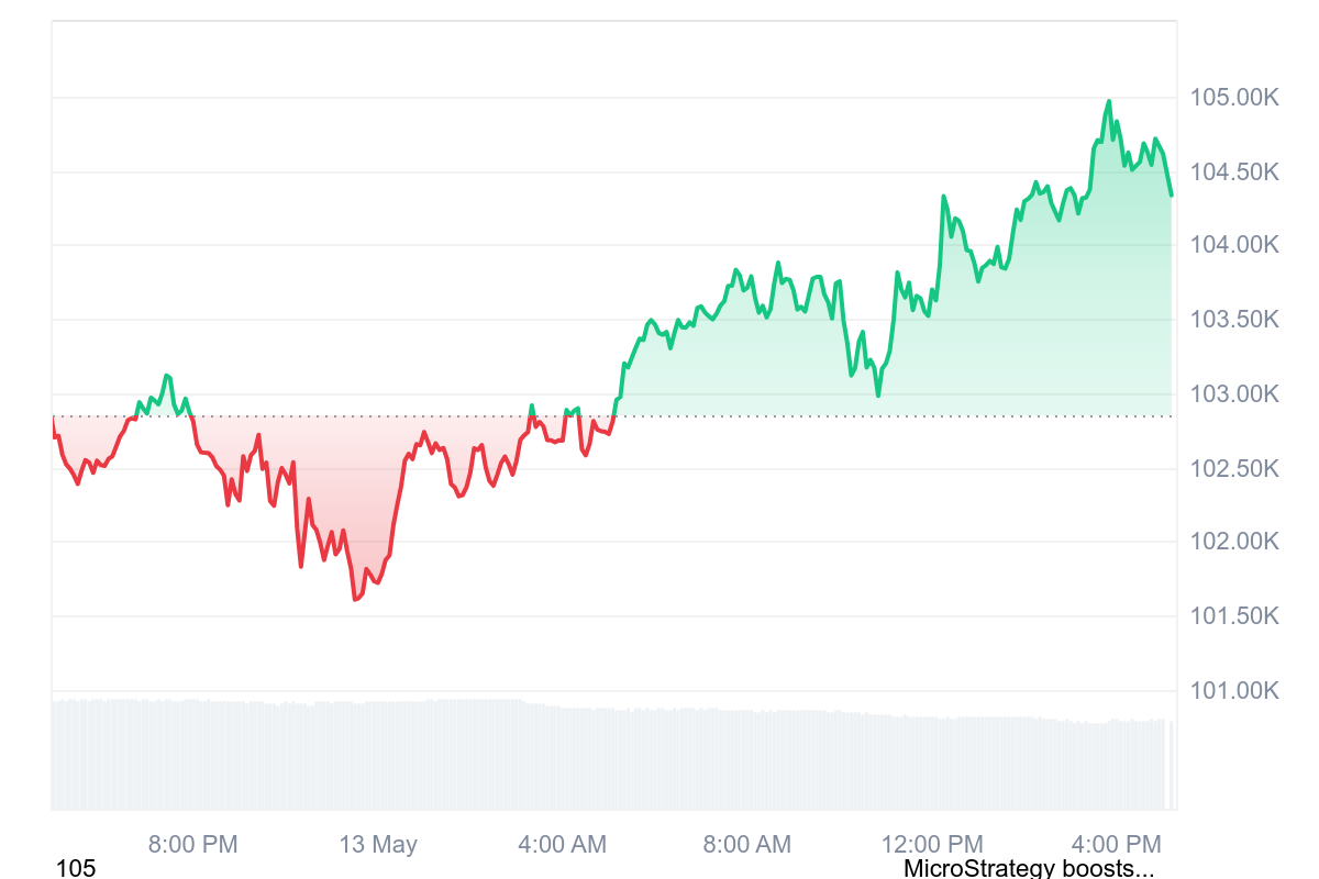 La pièce est passée d’un point bas journalier inférieur à 102 000 $ jusqu’à un point haut de 105 000 $. Au moment de la rédaction, le prix du BTC est de 104 333 $ après une hausse journalière de 1,73 %. Avec un CPI US meilleur qu’attendu, un nouvel ATH est fortement attendu.