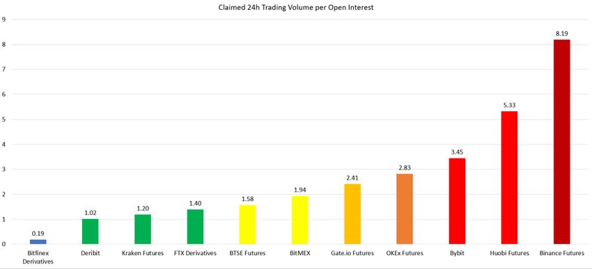 Cet indice correspond au ratio entre le volume de trading sur 24h affiché par la plateforme, et l’intérêt ouvert. Sans grandes surprises, Binance présente le score maximum de 8,19. Bitfinex, au contraire, est en bas de l’échelle avec un résultat de 0,19. Quel est alors le degré d’efficacité de cet indicateur en tant qu’outil de mesure du volume des dérivatifs crypto ?