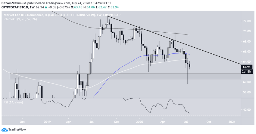 Le taux de dominance de Bitcoin (BTCD) évolue au sein d’un schéma haussier, non loin d’une importante zone de support. Un mouvement ascendant pourrait s’ensuivre, mais la tendance de long terme reste baissière, à moins que le BTCD dépasse les 65%.