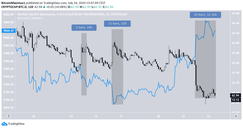 Cela veut dire qu’une hausse rapide du BTC entraîne un déclin du BTCD, et inversement. Si ce rapport se maintient, le cours du BTC devrait alors décliner pour que le BTCD augmente.