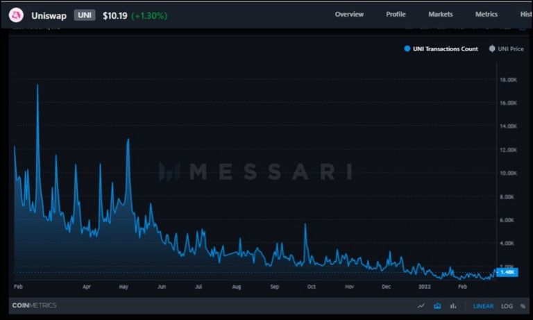 En novembre 2021, Uniswap a enregistré un volume mensuel record de 85 milliards de dollars. Ensuite, le DEX a clôturé 2021 avec un volume mensuel de 84 milliards de dollars en décembre. Les volumes enregistrés en janvier et février 2022 étaient inférieurs de 56% et 55% aux volumes enregistrés respectivement en novembre et décembre 2021.