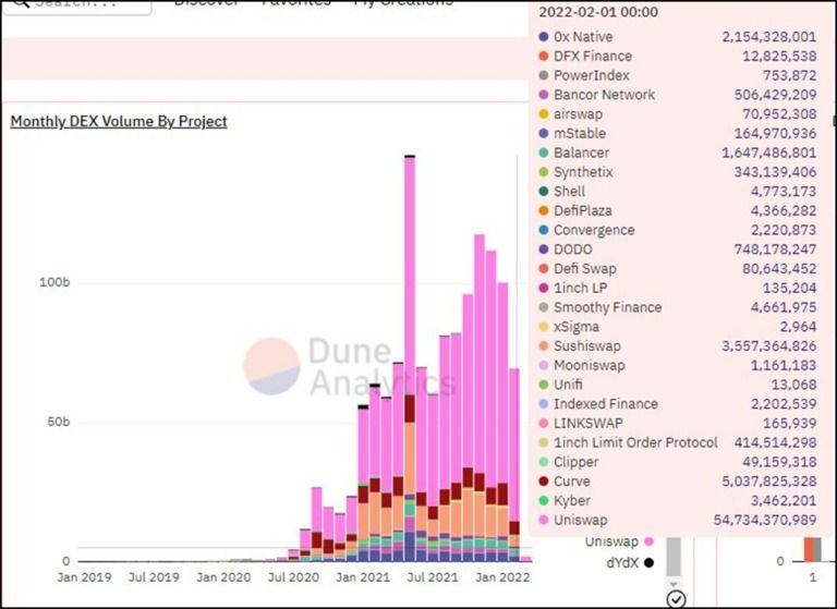 Février a été un mois difficile pour les exchanges décentralisés, en particulier pour Uniswap. Selon nos recherches, le DEX a enregistré environ 54 milliards de dollars de volume de transactions au cours du deuxième mois de 2022.