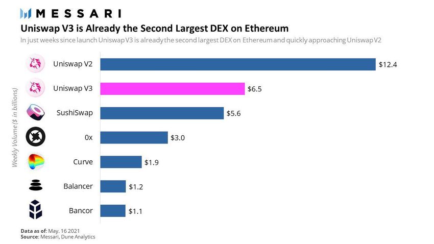 Le DEX a maintenant dépassé SushiSwap selon les données de Messari et occupe la deuxième place sur le réseau Ethereum avec un volume hebdomadaire de 6,5 milliards de dollars. Uniswap v2 est toujours le premier DEX basé sur Ethereum avec presque le double, soit 12,4 Mds$ par semaine.
