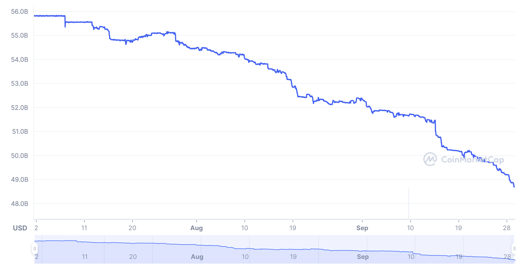 Cependant, on constate que depuis le mois de juillet, la capitalisation du stablecoin a commencé à chuter. Plus exactement, la valeur de marché de l’USDC a baissé de 14,98 % sous les trois derniers mois, passant de 56 milliards à 48,7 milliards de dollars. Pourtant, la capitalisation de l’USDT a connu une hausse de 2,71 % sous la même période.