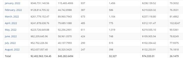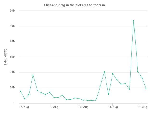 En juillet, le volume des ventes NFT s’élevait à 60 millions de dollars. Ce mois-ci les ventes étaient d’environ 52,7 millions de dollars au 28 août. Avec la baisse substantielle du nombre d’acheteurs uniques et de transactions, les ventes d’août ne franchiront probablement pas la barre des 60 millions de dollars.