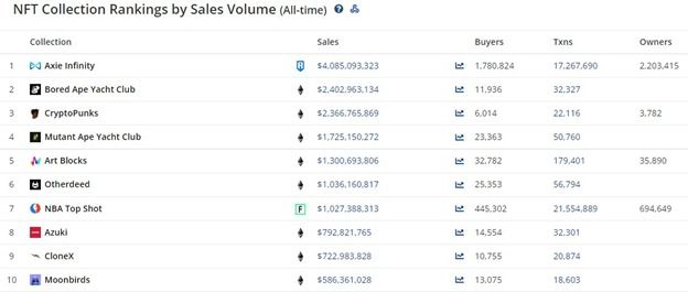Pendant très longtemps, CryptoPunks était la deuxième collection en termes de ventes NFT après Axie Infinity. Cependant, après avoir vendu plus de 2,4 milliards de NFT, Bored Ape Yacht Club a pris la place de CryptoPunks, dont le volume de ventes s’élève à environ 2,36 milliards de dollars.