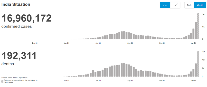 L’Inde connaît maintenant une augmentation exponentielle du nombre de ses cas, la deuxième vague s’avérant bien pire. Le pays a baissé sa garde à la fin de l’année dernière, les rassemblements religieux et politiques ayant contribué à la flambée de la maladie.