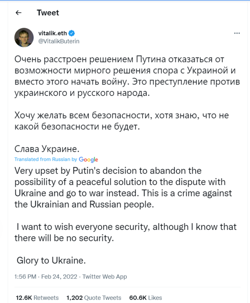 Vitalik Buterin a critiqué cette action, la qualifiant de “crime contre les peuples ukrainien et russe.” Bien qu’il soit né en Russie, le programmeur de 28 ans a conclu son message par ces mots : “Gloire à l’Ukraine.”