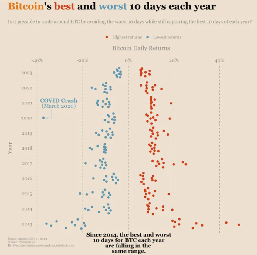 À en croire les données de @ecoinometrics, Bitcoin (BTC) a été très volatil au cours des dix dernières années. Voici ses 10 meilleures et pires journées depuis 2013.