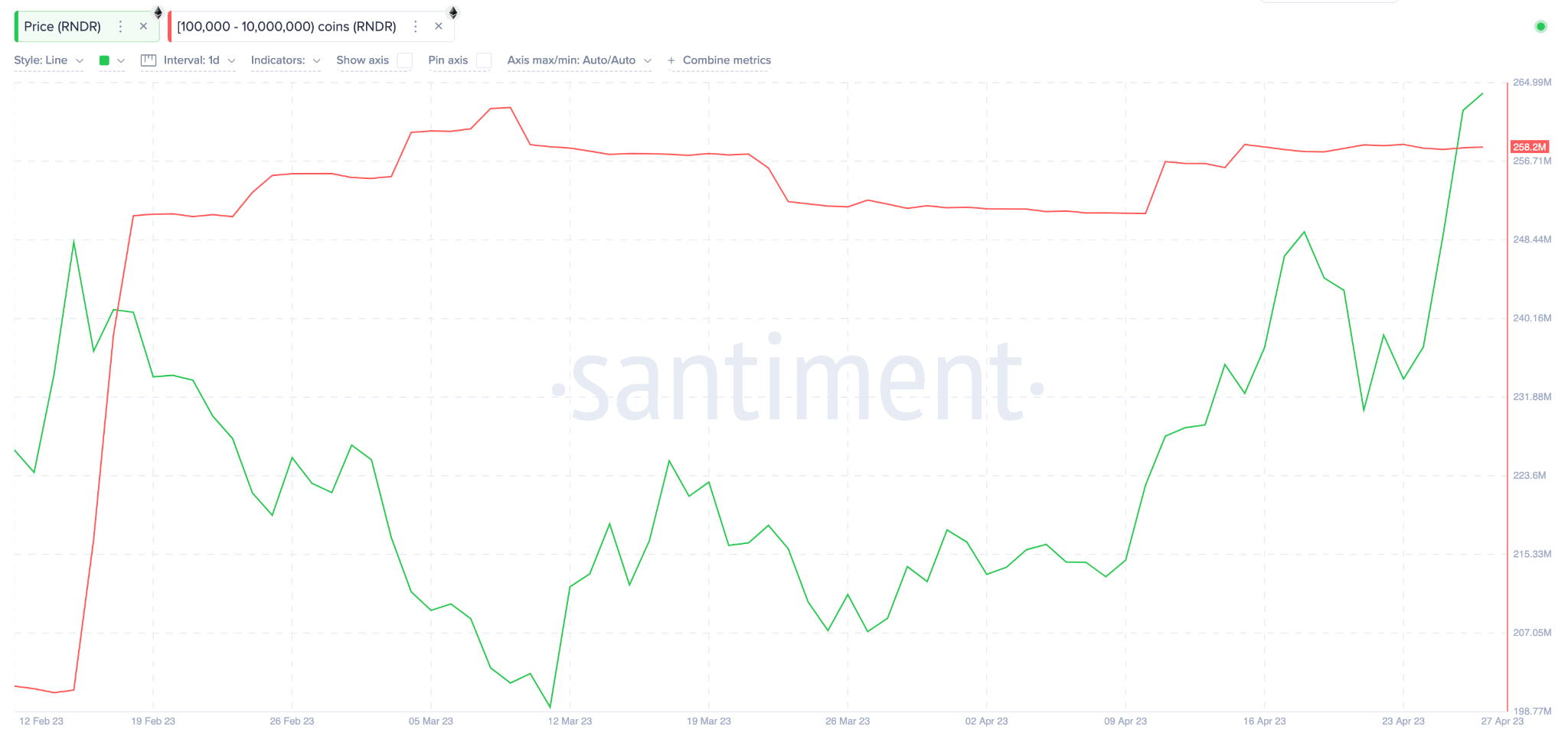 Sponsored SponsoredAinsi, le graphique ci-dessous montre que les crypto-baleines détenant de 100 000 à dix millions de jetons RNDR sont en phase d’accumulation et de HODL depuis le 12 février.