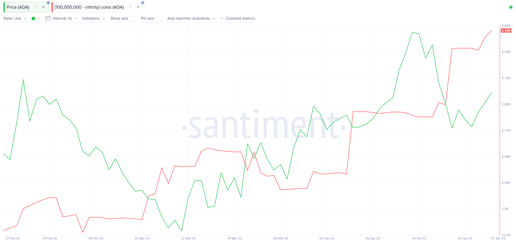En regardant de plus près la ligne rouge du graphique, on remarque que les baleines ont commencé à accumuler. Ce, depuis le creux enregistré vers la mi-mars. Cependant, la phase d’accumulation s’est intensifiée entre le 18 avril et le 27 avril. Au cours de cette période, les baleines ont ajouté 620 millions de pièces supplémentaires (soit près de 254 millions de dollars au prix actuel) à leurs wallets.