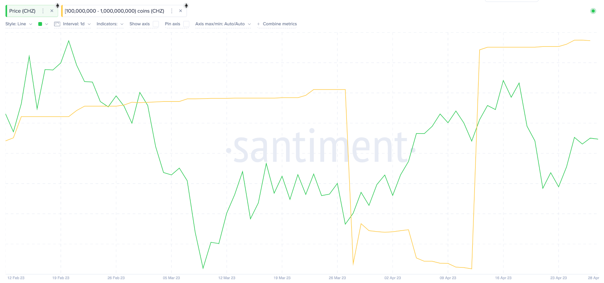 La ligne jaune du graphique ci-dessous représente les baleines qui ont acheté 1,10 milliard de jetons CHZ entre le 9 et le 28 avril. Au prix actuel (0,13 $), cela correspond à près de 143 millions de dollars.