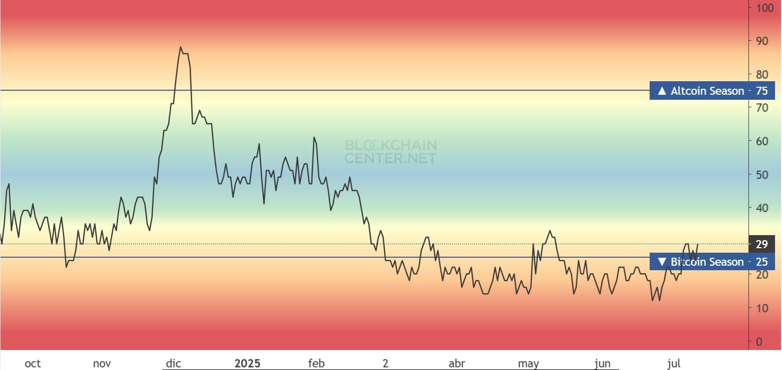 Si l’on se réfère à l’altcoin season index proposé par BlockchainCenter, on s’éloigne progressivement de la Bitcoin Season même si l’on reste encore bien loin de l’altcoin season.