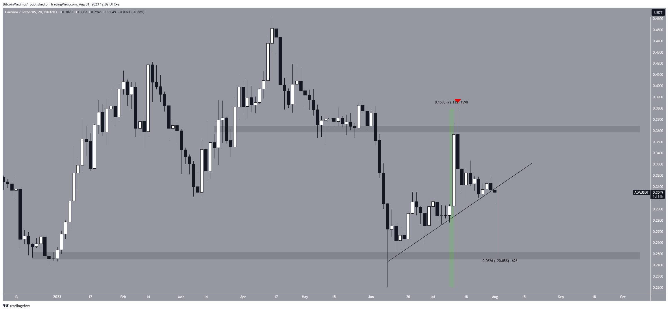 Le cours Cardano (ADA) a suivi une ligne de support ascendante depuis son plus bas annuel de 0,22 $ le 10 juin. L’augmentation a été rapide et a culminé avec un sommet de 0,38 $ le 14 juillet. Cela équivaut à un mouvement ascendant de 72 % mesuré à partir du bas annuel, autant dire une des meilleures performances au sein des altcoins.