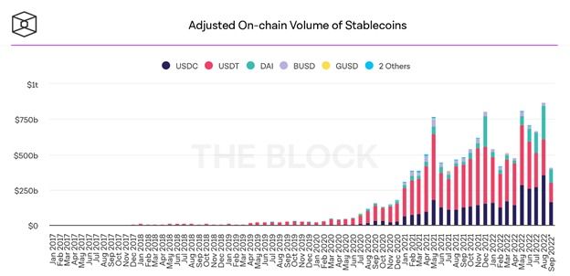 Après avoir atteint 668 milliards de dollars en juillet, le volume ajusté des stablecoins a atteint un sommet de 866 milliards de dollars en août. L’USDC, l’USDT, le DAI et le BUSD détenaient la majeure partie de ce volume.